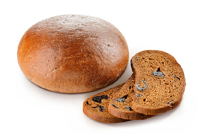 Хлеб пшенично-ржаной заварной подовый округлой формы из смеси муки пшеничной хлебопекарной высшего сорта и муки ржаной хлебопекарной обдирной с добавлением чернослива.